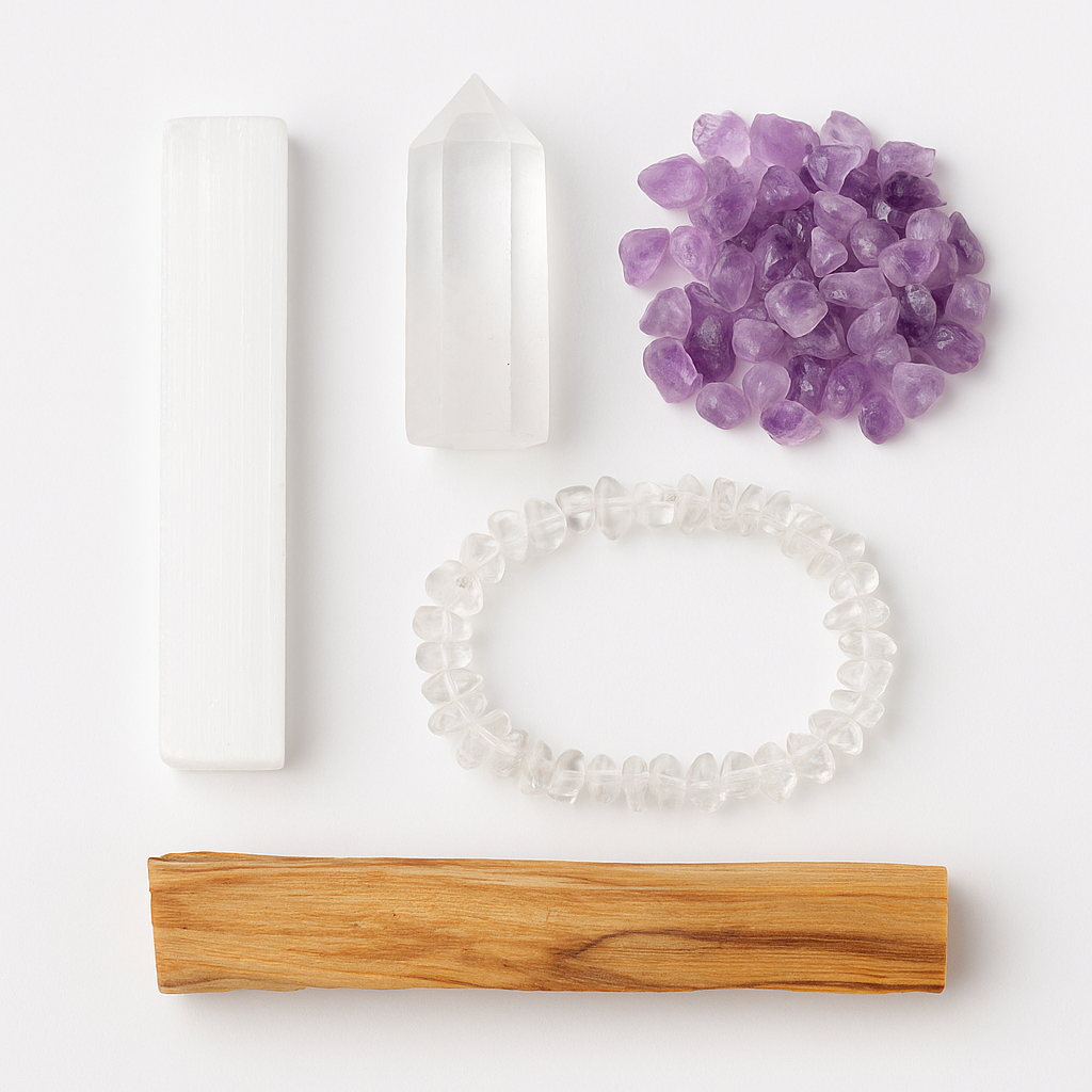 Incluye selenita, cuarzo blanco, amatistas pequeñas, cuarzo transparente y palo santo.
